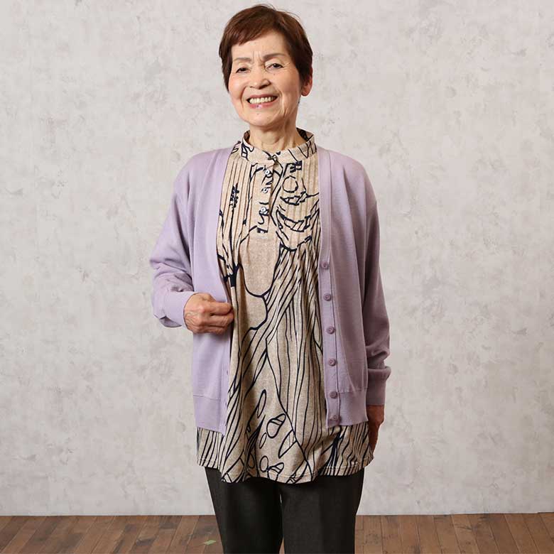 (素材)アクリル70% ウール30%(カラー展開)ブラック・グレー・ネイビー・濃紺・ベージュ・杢グレー・キャラメル・イエロー・グリーン・オレンジ・ピンク・サックス・ホワイト・パープル・エンジ・ピーチピンク・ローズピンク・杢ベージュ・オリエンタルネイビー・サックスブルー(生産国)日本製70代80代の方のためのおしゃれなシニアファッション(ハイミセス向け)の洋服を多数取り揃えています。