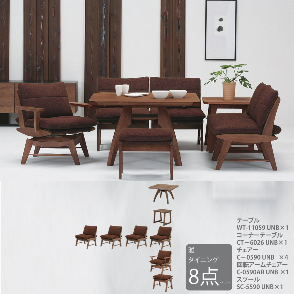 【本州、四国は開梱設置無料】 ミキモク 雅・リベラル LD8点セット 【テーブル、チェア4脚、回転アームチェア、スツール、コーナーテーブルのセット】 ブラウン WT11059UNB CT-6026UNB C-0590UNB C-0590ARUNB SC-5590UNB 雅・リベラル ダイニング8点セット